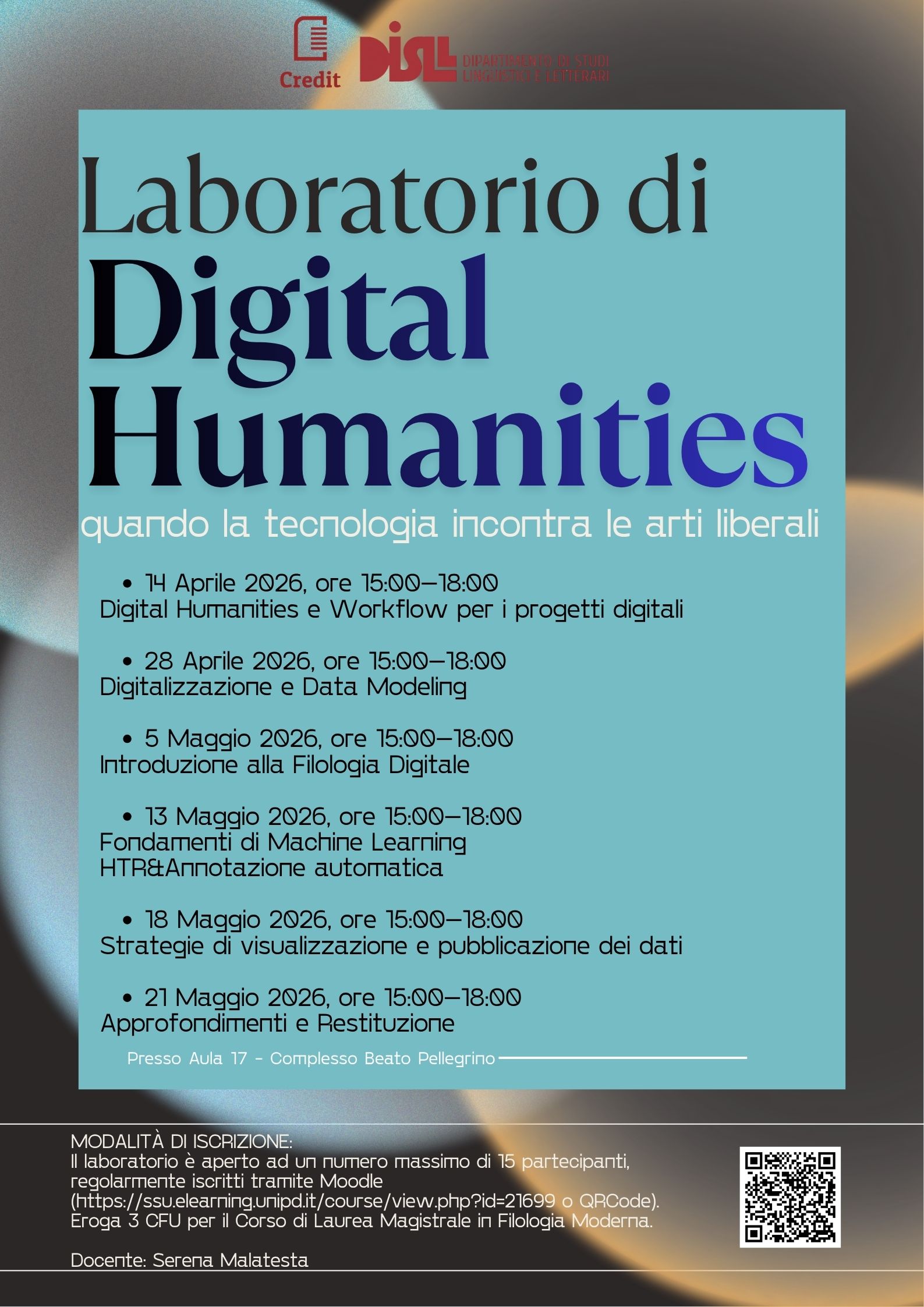 Il laboratorio permette di acquisire 3 CFU per altre attività per il corso di Laurea Magistrale in Filologia Moderna.